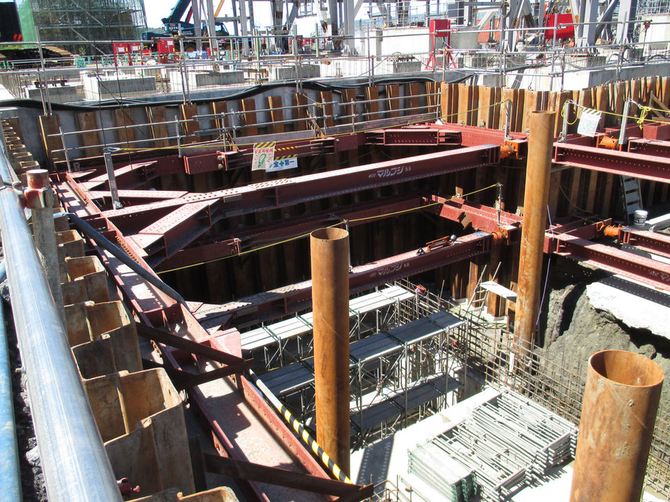 埋設物の解体や地下構造物を作っていくため、施工中の周辺の安全確保を目的として、掘削の進行に伴い側面を保護し、土砂や水の流出など地盤の崩壊を防止する対策を、様々な条件を調査、検討していただき適切な工法によって施工させていただいています。